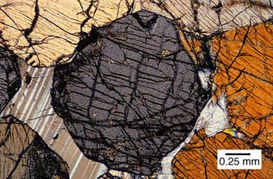 Hypersthene Orthopyroxenes are noted for having low, first-order interference colors. Also note the cleavages that intersect at about 90 degrees. Another identifying characteristic of orthopyroxene is its parallel extinction. |